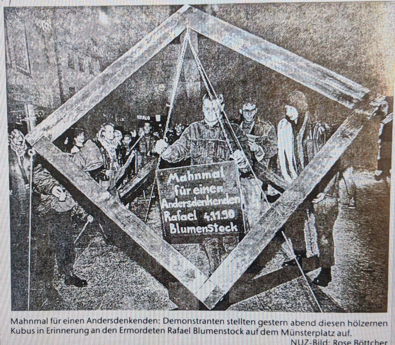 Deswegen fordern wir ein neues Mahnmal für Rafael Blumenstock, da das alte kaum sichtbar und beschädigt ist und es viel mehr für das Vergessen des Mordes als für die Erinnerung daran steht. Einen Vorschlag, wie das aussehen kann gab es bereits 1992 von verschiedenen Gruppen: Ein offener Kubus.